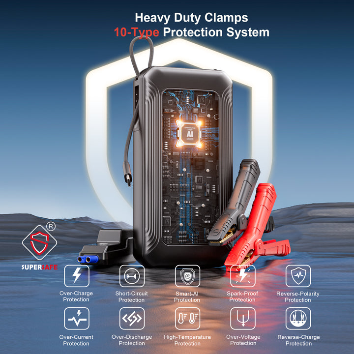 Q3: How do you know if this unit is connected to the vehicle correctly?A: With the battery clamps connected to the vehicle battery, when the indicator on the jumper cable shines a steady green light, it means it's connected correctly. If red light is on and solid with beeping, it means it's reverse connection.