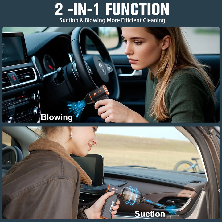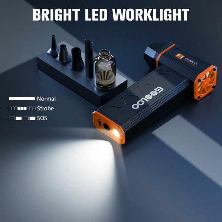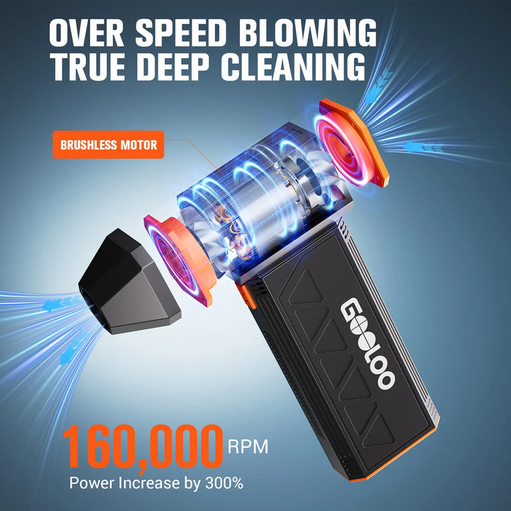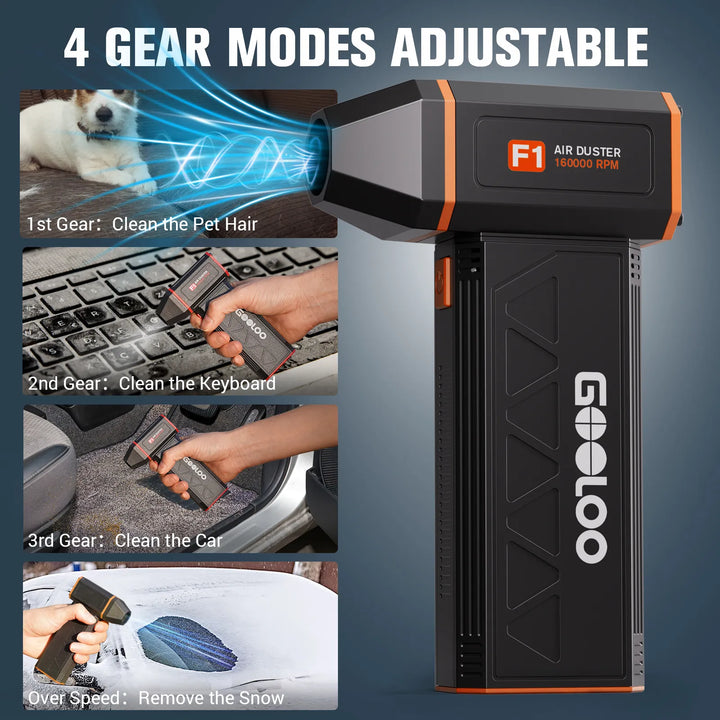 Elevate your cleaning game with the GOOLOO Compressed Air Duster. Boasting a powerful 160,000 RPM motor and adjustable 4-gear settings, this cordless air blower delivers a maximum wind speed of 45 m/s, effectively clearing dust and debris from your PC, keyboards, electronics, and even outdoor areas. Featuring a compact and lightweight design, the GOOLOO air duster comes with multiple nozzle attachments for customized cleaning. Enjoy the convenience of 3-hour fast charging and the added illumination of the built-in LED light, making it easy to tackle hard-to-reach corners. Versatile and reliable, this air duster is your ultimate cleaning companion for a spotless home, car, and beyond.